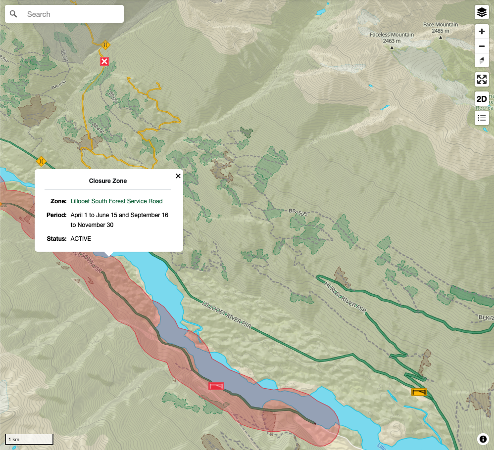 Closure zones are areas of land that prohibit vehicle travel for fixed periods of time. Often mandated by law through the Wildlife Act and more recently the Land Management Resource Plan. Backroadstatus.com automatically monitors these closure zones and posts notices when roads are affected by closures. You can view detailed information about each of these zones prior to heading out on the road and download them for offline use. Check out the Lillooet South FSR Closure Zone as an example.